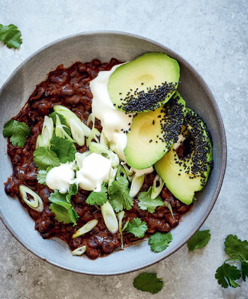 3. Add the cumin and vegetable stock and cook down for about 5–10 minutes to create a thick, chunky sauce. Serve with the sliced avocado sprinkled with basil seeds (if using), coriander/cilantro, spring onions/scallions and crème fraîche.