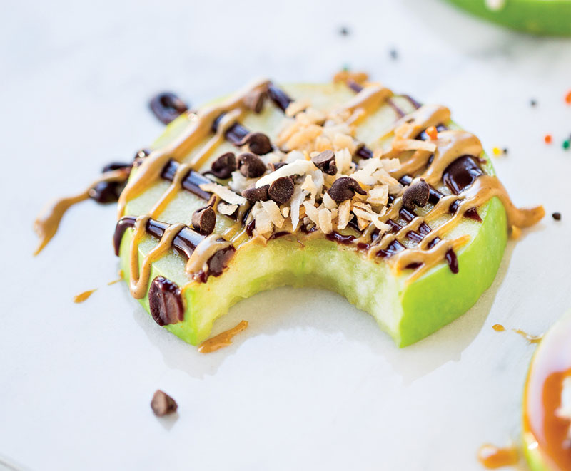 These apple doughnuts are a fun and healthy treat, and the kids will love to roll up their sleeves and decorate them with you. They remind me of a gourmet caramel apple, but are much easier to make. Dress up the apples with toppings such as coconut, sprinkles, chocolate chips, nuts, and Dreamy Caramel Sauce.