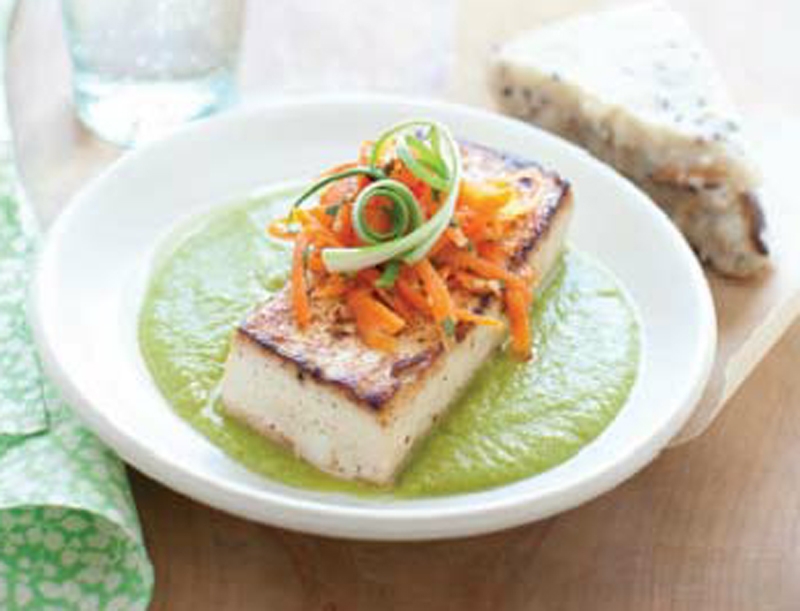 - Spoon about 2 tablespoons of the pea puree on each of 4 serving plates and top with a piece of tofu. Garnish with carrot relish and scallions or cilantro. Put a grit cake on each plate and serve.