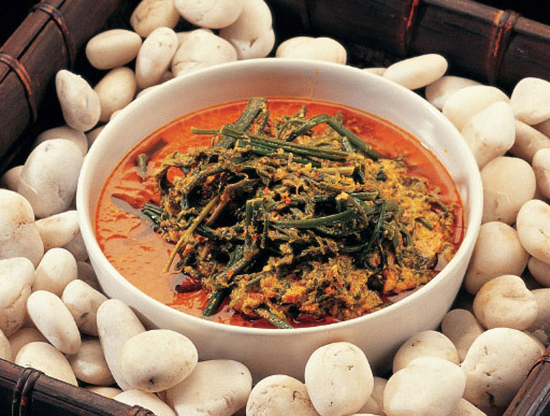 - Bring the Spice Paste and coconut milk to a boil in a saucepan. Reduce the heat to medium and simmer uncovered for 2 minutes. Add the fern tips or asparagus, salam leaves and Tamarind Juice, mix well and bring to a boil again, then simmer for about 15 minutes, stirring frequently until the vegetables are tender. Season with the salt and remove from the heat.