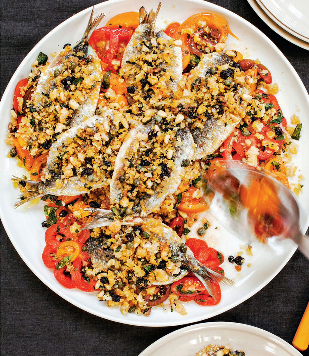 You are at:Home»Recipe»Baked sardines with sourdough crumbs and heritage tomato salad recipe