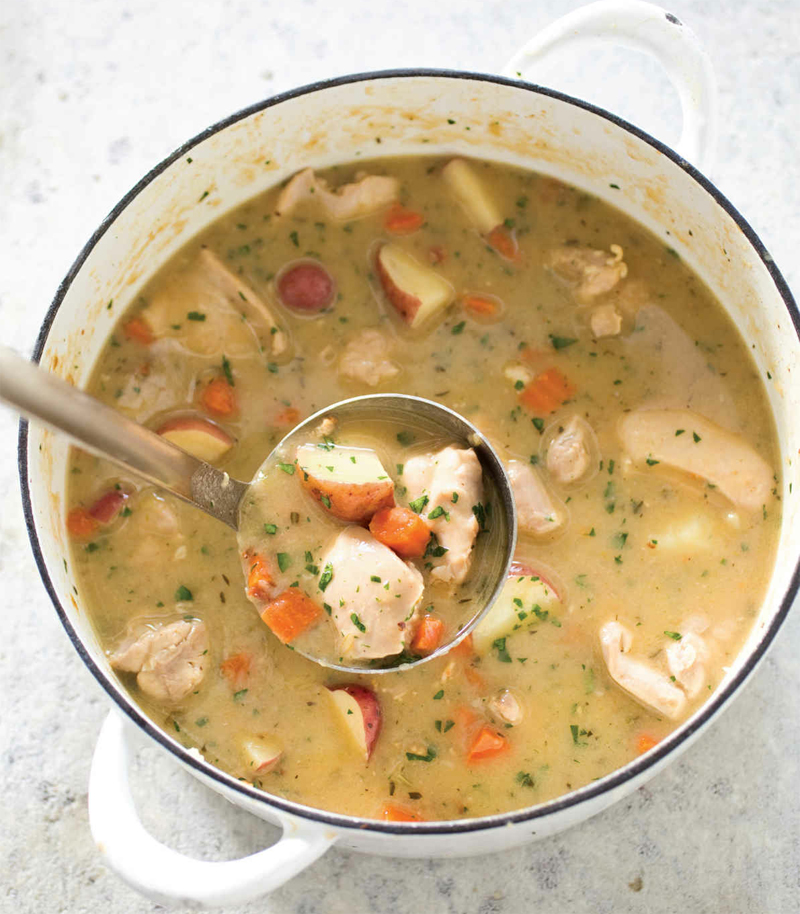 Fond the flavorful browned bits that collect in the pot when searing meat or aromatics is key for making a stew with deep, robust flavor. An enameled Dutch oven helps build fond thanks to its thick walls, and the light-colored enamel makes it easy to monitor browning. We capitalized on this for a chicken stew that would satisfy like its beef brethren. Searing collagen-rich chicken wings provided lots of chicken flavor and thickening gelatin, while boneless thighs yielded tender stew meat. Lots of sautéed aromatics contributed to a hefty layer of fond, and cooking the stew uncovered in the oven encouraged the creation of even more fond on the pot’s sides. Mashed anchovy fillets (rinsed and dried before mashing) can be used instead of anchovy paste. Use small red potatoes measuring 1½ inches in diameter.