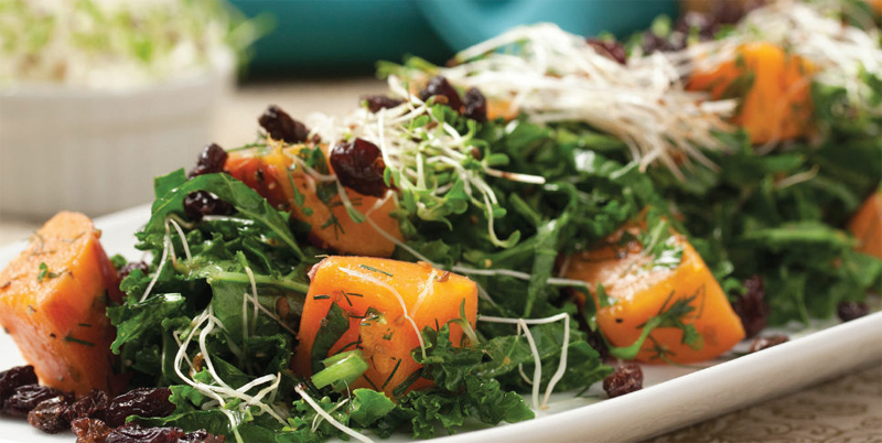 - Place the butternut squash on a baking sheet sprayed with non-stick olive oil and bake f or 30 minutes. When squash is cool, peel and cut into pieces. For Dressing