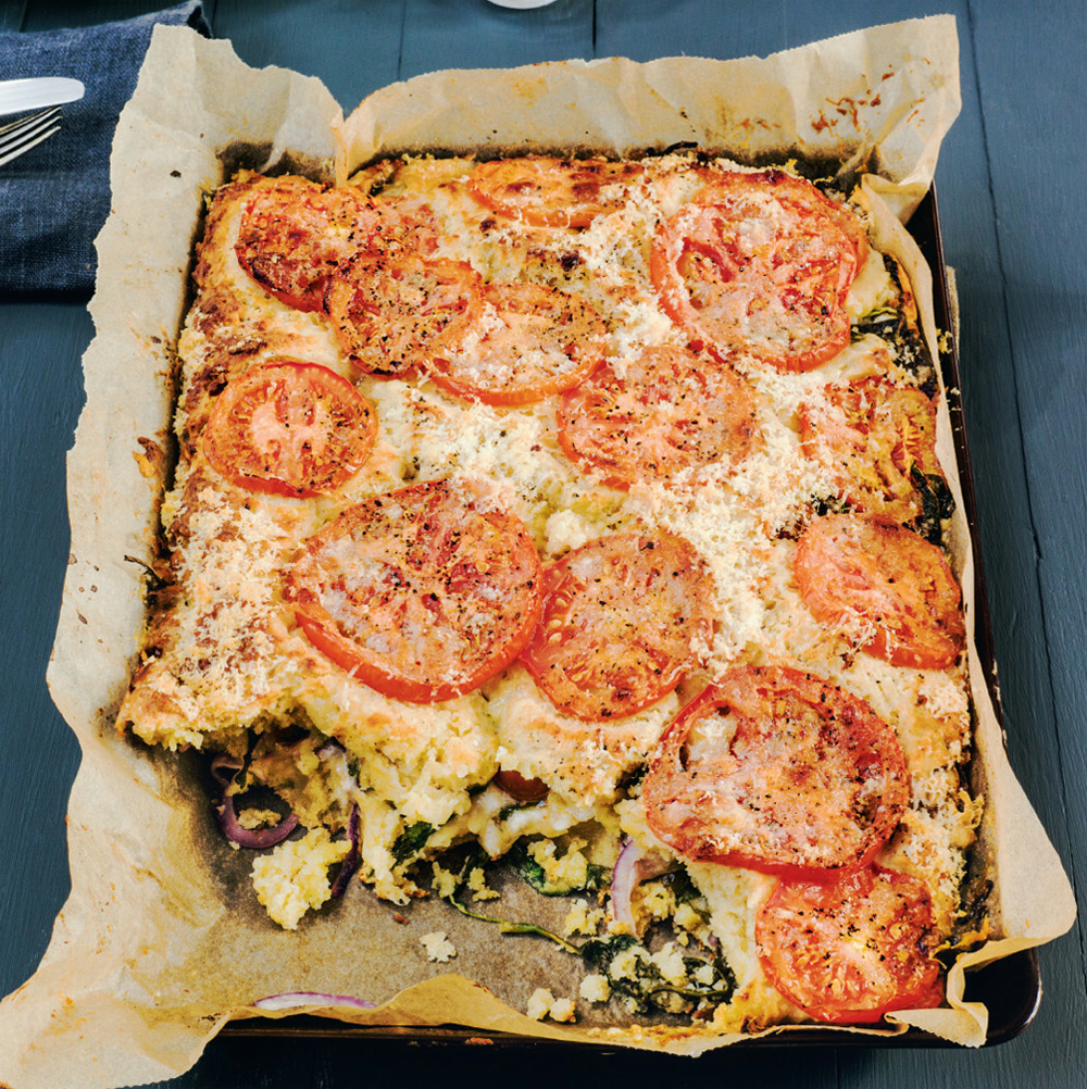 5. Take half the dough and scoop lumps of it into the tray. With the back of a large spoon, dipped in water so it doesn’t stick to the dough, press the lumps down into a reasonably even layer that covers the whole of the base of the tray. Pour the filling evenly over the dough, including all the juice. Scoop the rest of the dough on top, moving it around with the wet spoon to cover all the filling. Top with the slices of tomatoes, some black pepper and flaked sea salt, and a drizzle of olive oil. Bake the giant scone for 25–30 minutes, rotating it half way through the baking time to ensure an even bake. Test it by sliding a palette knife or spatula under the bottom and lifting it up to peek at the base. If it’s an even, golden brown, the scone is cooked all the way through. As soon as you take it out of the oven, scatter over the grated Parmesan. Serve warm. This won’t cut into neat slices, so don’t bother to try.