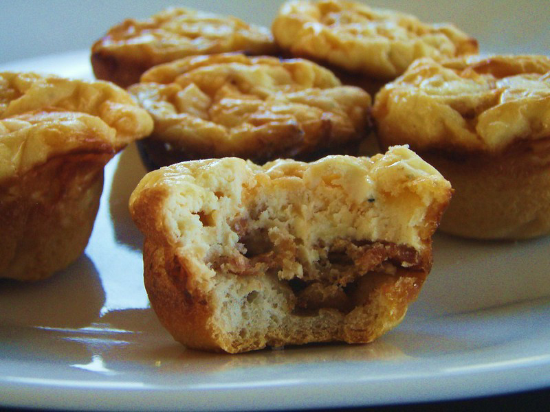 - Stir together the dry and wet ingredients. Add in bacon and cheese to mix well.
