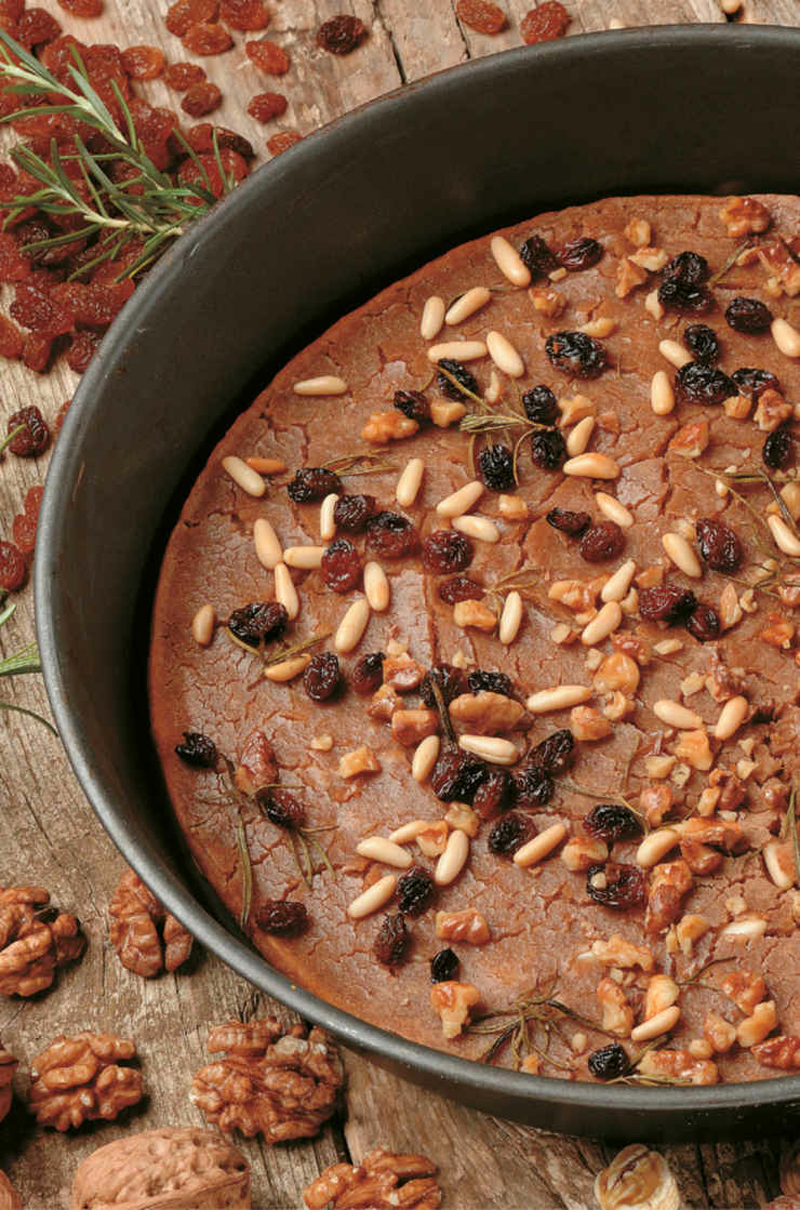 2. Oil a baking pan, and pour in the batter. Sprinkle with rosemary, raisins, pine nuts and chopped walnuts.