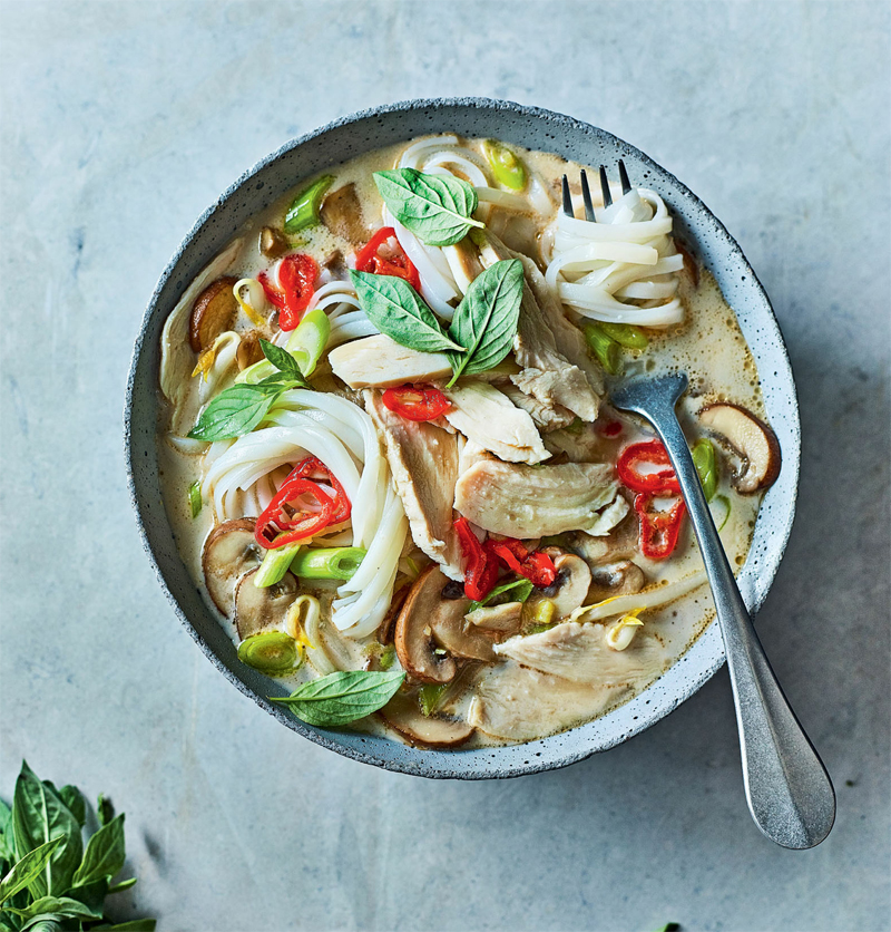 - Heat the oil in a deep frying pan (skillet) or wok set over a medium–high heat, add the spring onions (scallions), mushrooms, garlic, ginger, chilli and lemongrass and stir-fry for 2–3 minutes. Add the hot stock, coconut milk and nam pla. Reduce the heat and simmer for 5 minutes, then add the chicken and simmer gently for 5 more minutes until everything is hot.