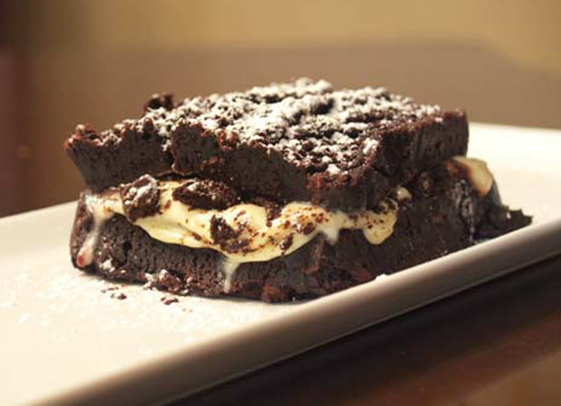2. Spread mascarpone over one brownie, followed by crumbled chocolate sandwich cookie and hot fudge. Close sandwich with other half of brownie.