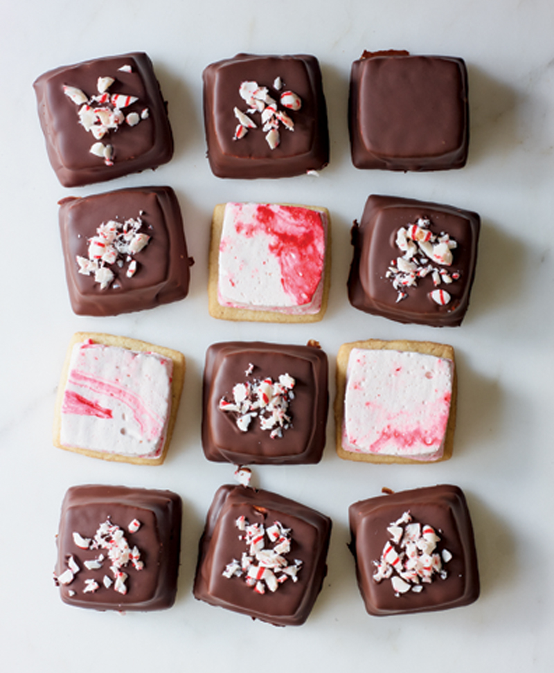 - In a stand mixer fitted with the whisk, beat egg whites at medium-low speed until foamy. In a medium saucepan, combine sugar with corn syrup and remaining 1 cup water. Bring to a boil, stirring occasionally. Cook over moderate heat, without stirring, until syrup registers 260° on a candy thermometer, about 10 minutes. Remove pan from heat; stir in gelatin until melted. Drizzle hot syrup into egg whites down side of bowl, beating at medium speed. Add vanilla and beat at high speed until thick and glossy, about 10 minutes. Using a rubber spatula, fold in 1 cup peppermint candies. Sprinkle in food coloring, then scrape marshmallow mixture onto baking sheet, swirling food coloring, and smooth surface. Let stand at room temperature until set, at least 2 hours or overnight. Make Cookies