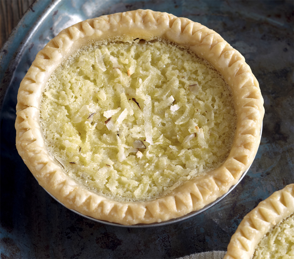 - Pull middle oven shelf out and center cooled pie shell on baking sheet. Pour buttermilk filling directly into pie shell and scatter remaining 1⁄4 cup grated coconut evenly on top.