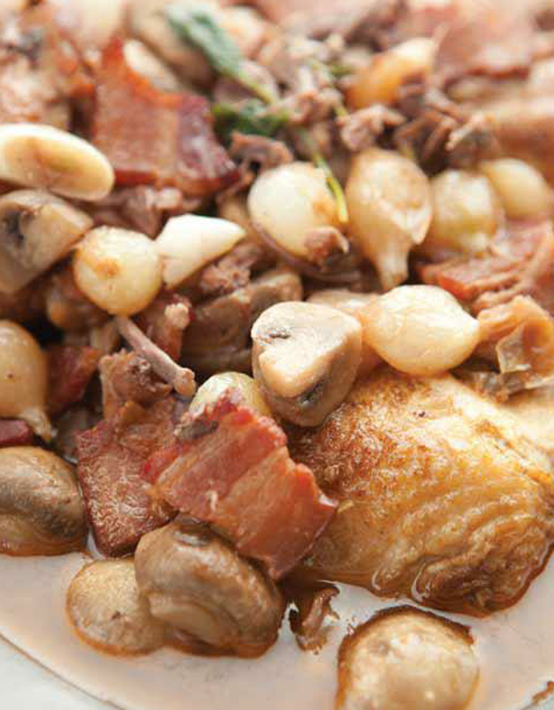 - This part is optional, but highly recommended: using tongs or a slotted spoon, remove the chicken, mushrooms, onions and bacon to a platter. Raise the heat in the pan up to high, bring to a boil, and cook until liquid has thickened slightly and is reduced by about half. Return the chicken, mushrooms, onion and bacon back to the pan, heat through for a few minutes, and serve.