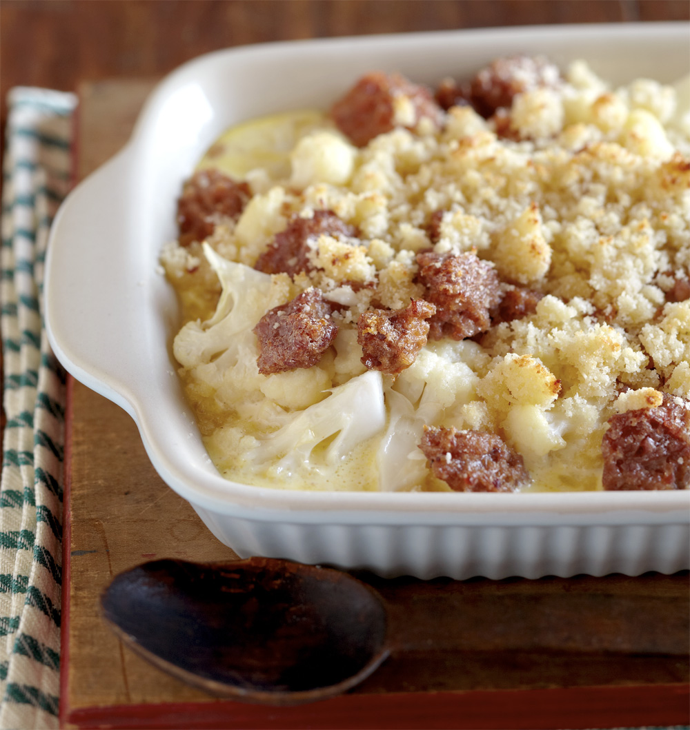 natural with the whole huge cabbage family and that includes cauliflower, which Mark Twain once called “a cabbage with a college education.” Note: Use cooked ready-to-eat country ham here—a good cured and smoked ham like the Smithfield or Edwards hams of Virginia. If unavailable, substitute thickly sliced prosciutto or a domestic serrano, better than mass-produced pink packing house hams, most of which have been injected with water or brine. Note: I processor-chop the ham—quick and easy though the ham must be cut into 1-inch chunks before it goes into the machine. For 2⁄3 cup coarsely ground or chopped ham, you’ll need about 6 ounces if the ham has a thick outer covering of fat, which should be removed. If not, 4 ounces will do. Tip: Newsom’s of Kentucky sells ground cooked country ham.