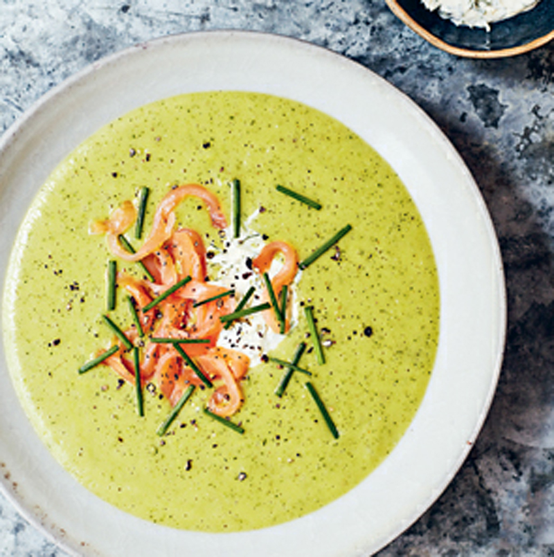 - Ladle the soup into warmed bowls and top each serving with a spoonful of the dill soured cream. Finish with a scattering of salmon ribbons, a few snipped chives and a good grind of coarse black pepper.
