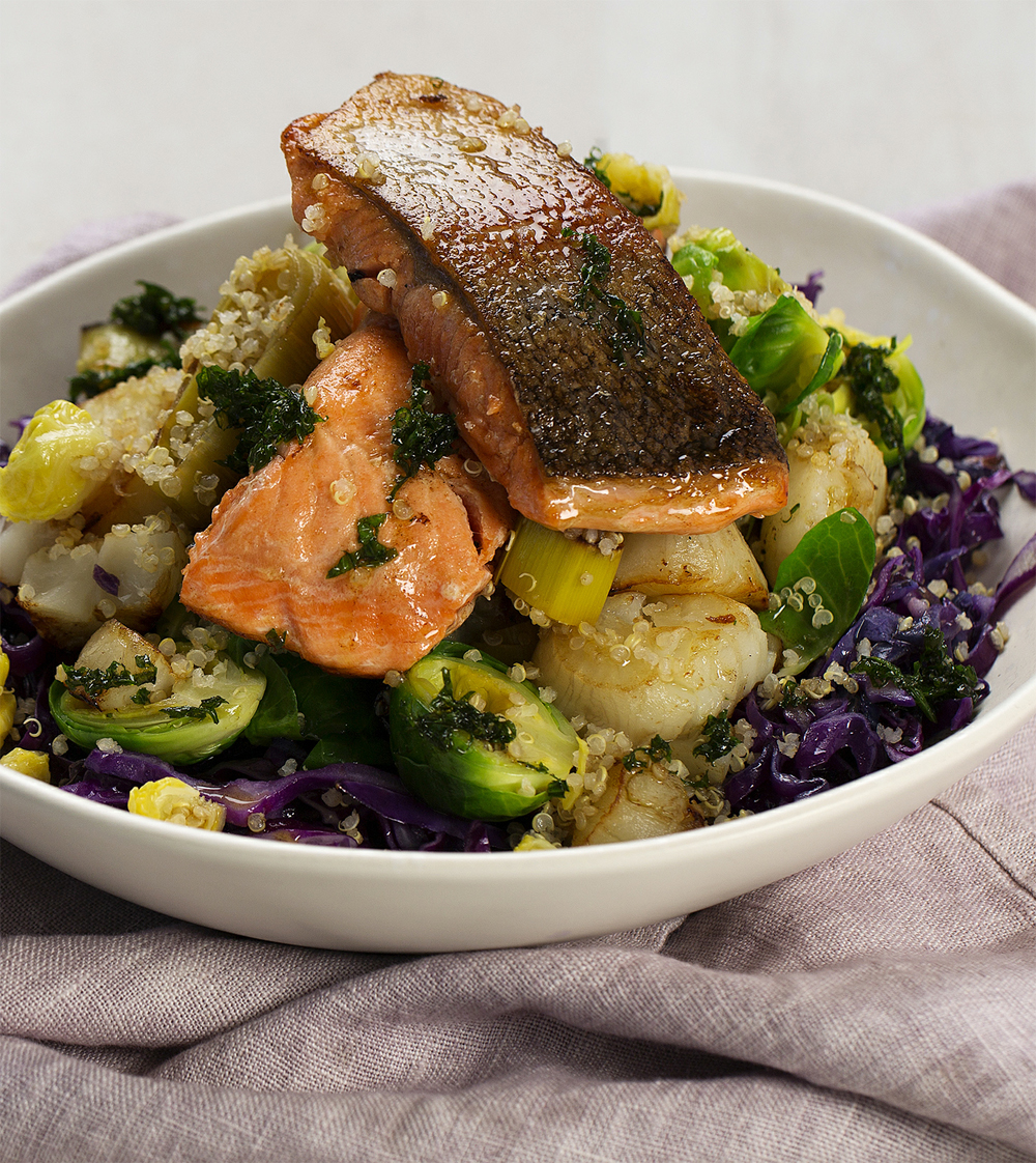 Given that we live in the country, I’m grateful that salmon freezes really well, and it’s the closest thing to a convenience food I’m likely to have on hand. Ocean trout freezes quite well too, it’s all about the fat content, but I don’t freeze any other type of fish. Of course, always source salmon from a sustainable producer. I buy it by the side of salmon with skin on and cut it into serving-sized pieces, which I carefully wrap and keep in the freezer. This dish is all about maximising the vegetables of winter together with some quinoa, and could in fact be a stand-alone meal without the fish. Having said that, it’s decidedly moreish when the salmon skin is really crisp but the flesh is only just cooked.