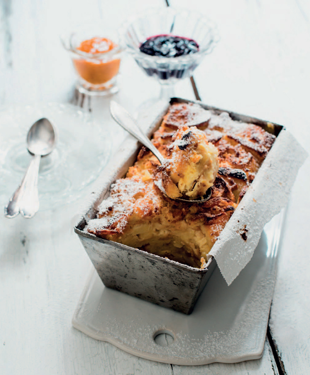 - Preheat the oven to 360°F (180°C) or 320°F (160°C) (convection oven). Grease a loaf pan with butter. Pour one-third of the croissant mixture into the dish, then cover with a layer of apple slices and sprinkle with cinnamon sugar. Repeat, then cover with the rest of the croissant mixture. Whisk the remaining ½ cup cream or milk with the egg yolk and pour over the baking dish. Sprinkle on the remaining cinnamon sugar and pieces of butter. Bake on the second oven rack from bottom for about 45 minutes, until golden brown and crispy.