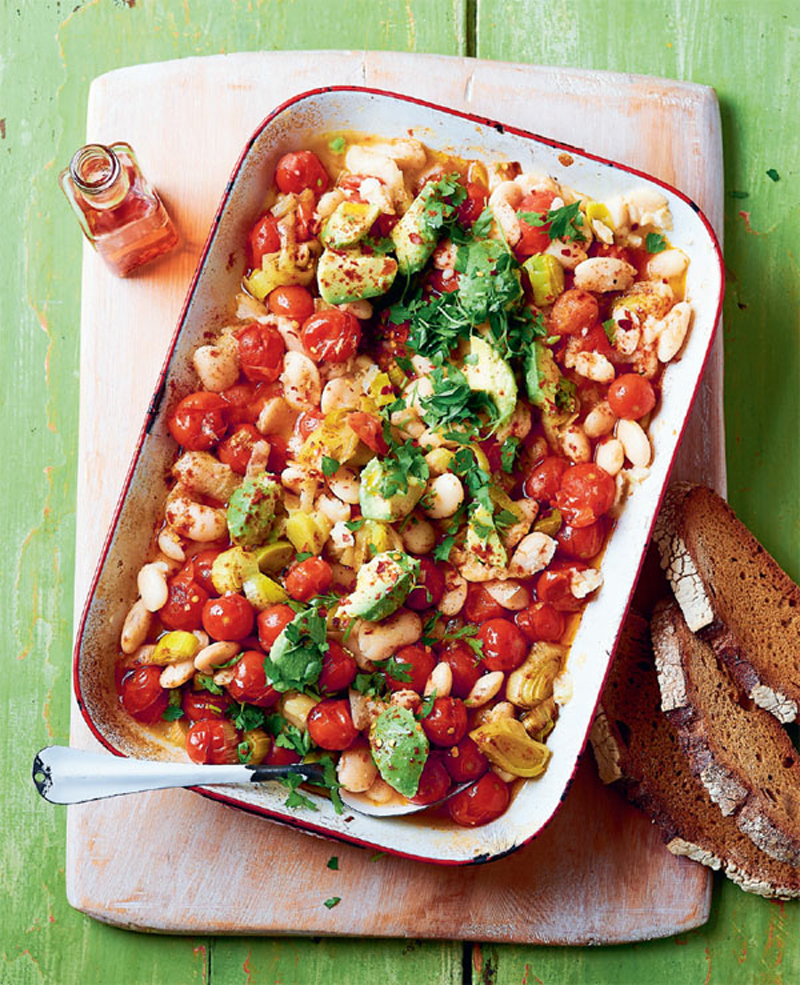 - Remove from the oven. Cut the avocados in half, remove the pits and scoop out the flesh using a teaspoon. Arranged evenly over the beans and tomatoes. Drizzle with chilli/chile oil (if using), add a light sprinkling of paprika and garnish with parsley leaves.