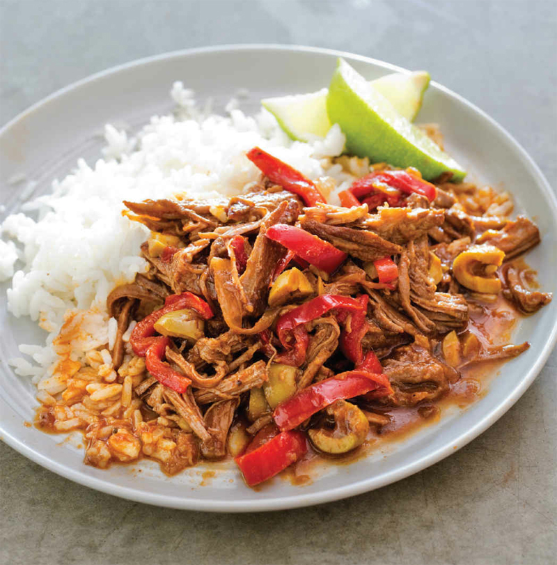Cuban ropa vieja is a hearty, rustic dish of braised and shredded beef, sliced peppers and onions, chopped green olives, and a brothy sauce. Traditionally, the dish requires simmering beef in one pot, and then using the meat and some of its broth in a separate sauté of onions, peppers, and spices. To simplify, we combined the two steps into the ease of a Dutch oven braise, which also meant that all the beef’s flavorful juices ended up in the final dish. We eschewed typical flank steak, which can turn out dry, in favor of brisket, which has great beefy flavor and enough collagen to guarantee tender, juicy shreds. Cutting the brisket into 2-inch-wide strips sped up cooking and made shredding a breeze. Searing the meat before braising and adding glutamate-rich anchovies gave the dish serious savory flavor. We caramelized the onions and peppers and then set them aside while cooking the beef so they would retain some texture. Reserving the briny green olives for the end kept their flavor sharp. Depending on the size of your Dutch oven, you may need to brown the beef in two batches rather than one. Serve with rice.