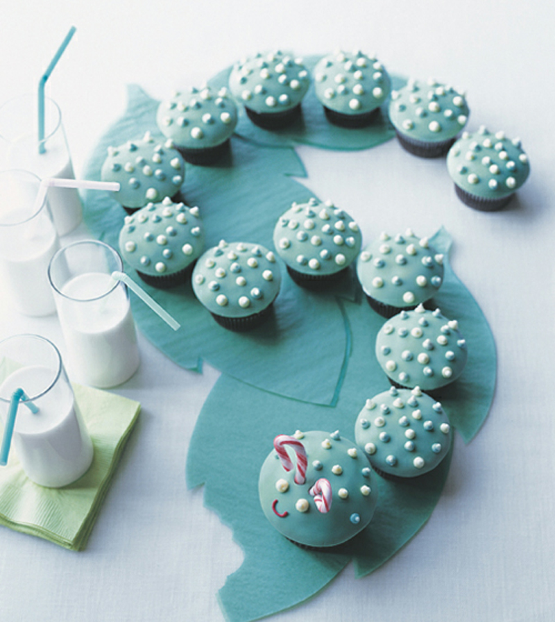 This oh-so-cute caterpillar, made by arranging fondant-covered cupcakes in a curved line, makes a memorable arrangement for a baby’s first birthday party. Here, one jumbo cupcake is used for the head and a dozen standard cupcakes make up the body; the remaining standard cupcakes can be frosted for serving alongside or decorated as instructed below and added to the caterpillar to accommodate more guests. Or you can make two caterpillars by baking the batter in two jumbo and 26 standard cups.