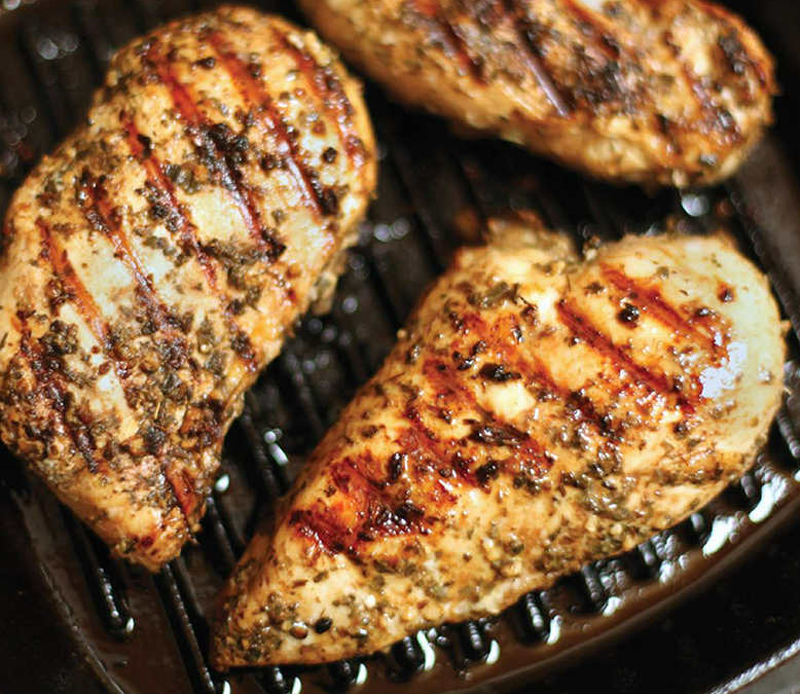 3. Reduce the heat to medium and cook until the center is no longer pink. Remove the breasts from the pan and let them rest. Pour the remaining marinade into the grill pan and bring to a boil before pouring over the breasts.