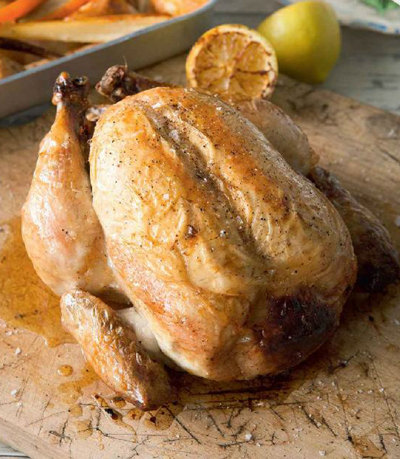 - Divide the stuffing between the neck end of the chicken and the cavity, then put the chicken in a roasting tin. Smear butter all over the chicken skin and season with salt and pepper. Squeeze the lemon juice over the chicken too.
