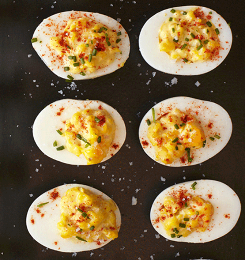 2. To the yolks, add the mayonnaise, mustard, Tabasco, and shallots. Mash with a fork until smooth. Season with salt and pepper. Mound the yolk mixture back into the whites with a spoon (or pastry bag for a more finished look). Garnish with chives and a sprinkle of paprika.