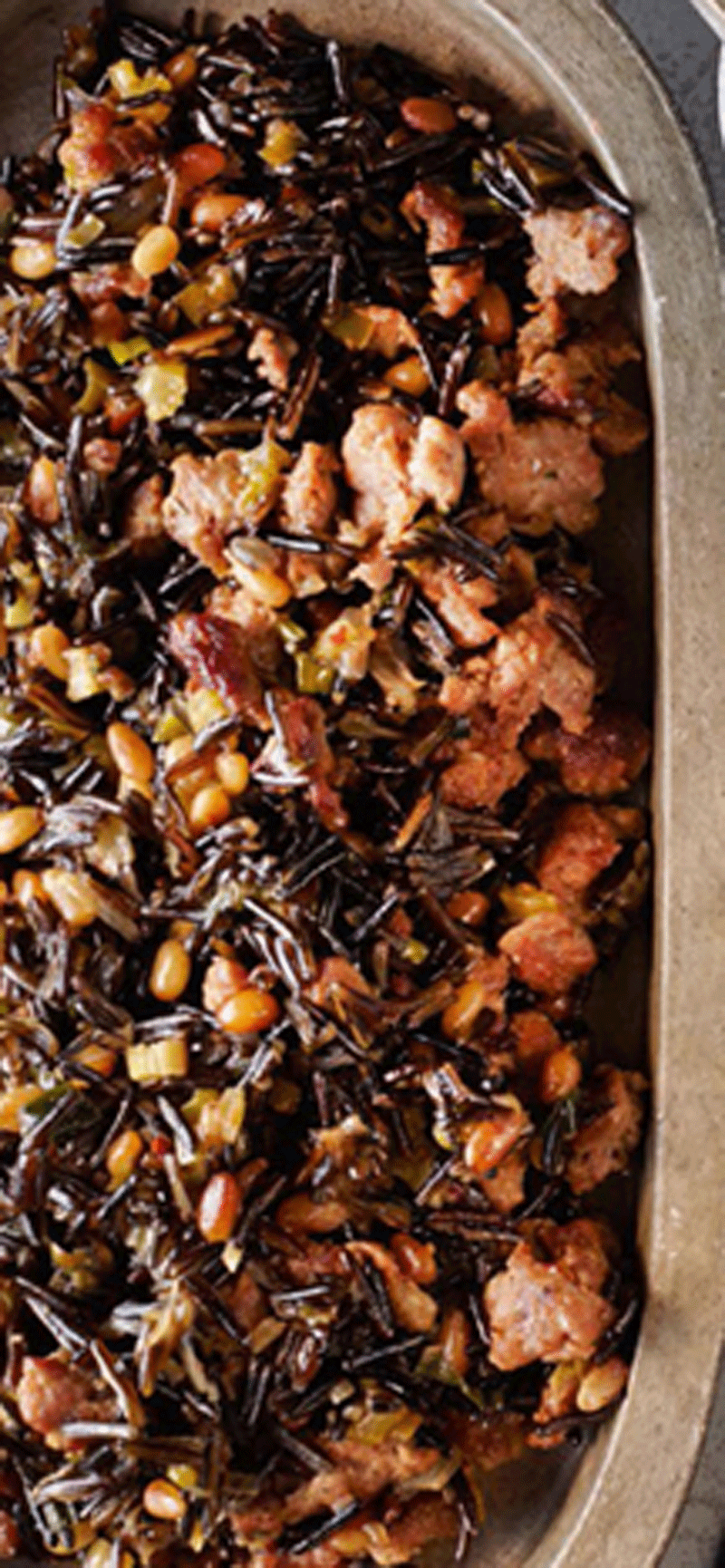 Here pine nuts give the rice crunch and texture. And dirty rice is the best way to use up what is left over in the fridge, too a kind of catch-all for bits and pieces. Wild mushrooms can be substituted for the chicken livers and sausage to make this a lighter dish.