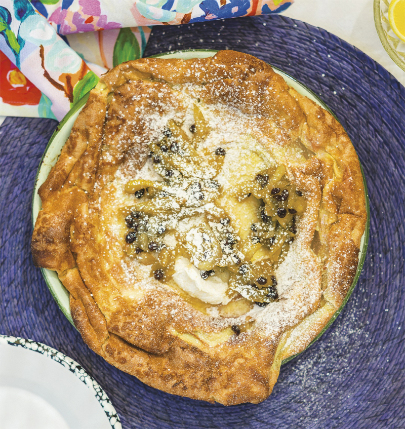 - Serve the pancake immediately, in the pan, topped with the sautéed apple compote and some salted butter. Dust with confectioners’ sugar and squeeze with lemon.