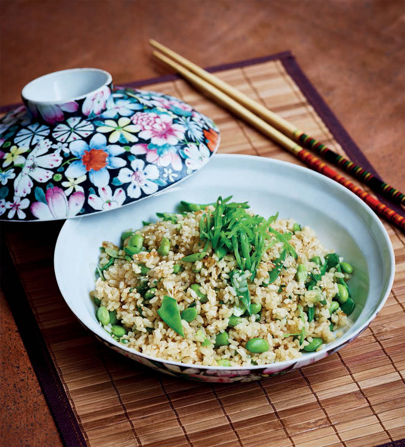 Edamame beans are green soybeans that are usually cooked in their pods and eaten as a snack with beer in Japan. Here, I use the bean and other greens to make edamame rice cooked in a dashi and soy saucebased broth. A fragrant, springtime dish.