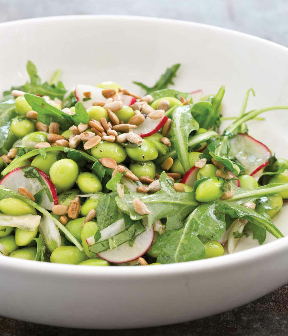 We love snacking on edamame steamed in their shells, but to turn these immature soybeans into a more substantial salad, we took advantage of frozen, shelled edamame, a great source of vegetable protein and isoflavones, and tossed them with a vibrant mix of arugula, basil, and mint. The sweetness of the basil and mint complemented the peppery arugula, and the edamame’s neutral flavor and satisfying pop of texture paired well with the fragrant greens. Though fresh herbs are often used in minimal amounts for seasoning, we wanted to treat them like salad greens and used a handful of each, ensuring tons of flavor and a host of extra vitamins and minerals. Thinly sliced shallot added mild onion flavor, and just a couple of radishes added crunch and color. For the vinaigrette, we chose to use rice vinegar for its mild acidity, which would complement and not overpower the edamame, and added a little honey for sweetness and to help emulsify the dressing. One small clove of garlic added flavor without taking over the dish. The finishing touch was a sprinkling of roasted sunflower seeds, which added nuttiness and depth to our bright salad.