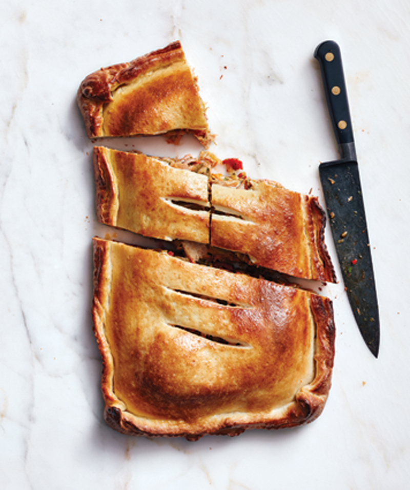 - Preheat the oven to 425°. Grease a large rimmed baking sheet. Unroll 1 of the pizza crusts on the prepared baking sheet. Spoon the cooled filling evenly on the dough, leaving a 1-inch border. Unroll the remaining pizza crust and lay it on top of the filling; crimp the edges to seal. Brush the empanada with the egg wash and, using a paring knife, cut a few slits in the top. Bake empanada for 13 to 15 minutes, until puffed and browned. Slide onto a rack to cool completely, about 1 hour. Cut into squares and serve.