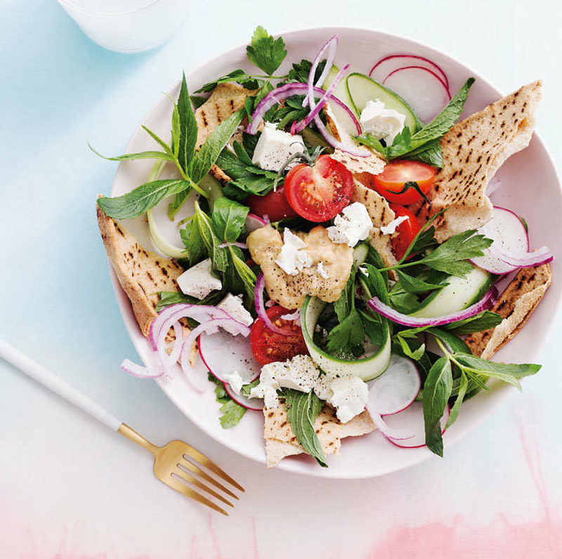 4. To serve, place the pita pieces, cucumber, tomato, radish, onion, mint, and parsley in a serving bowl and toss gently to combine. Drizzle over the hummus dressing and top with the feta.