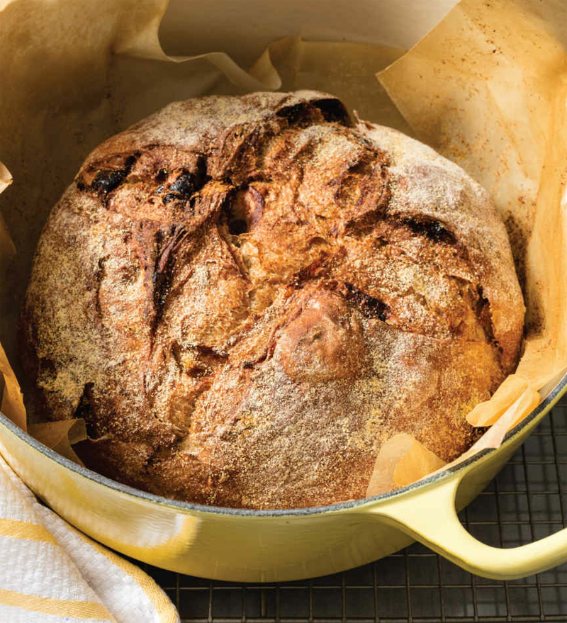 This sophisticated loaf calls on the elegant combination of sweet figs and earthy fennel seeds for a bread that’s perfect with cheese and charcuterie plates. We wanted our loaf to have the rustic and open crumb of great bakery breads, so we turned to our Dutch oven. Often, artisanal-style breads are baked on preheated baking stones and lava rocks are placed in the oven to create a moist environment; together, the hot stone and the steam produce an open, airy crumb, a good lift, and a nicely browned, crisp crust. We found that we could do away with both of these specialty items and achieve the same effects by preheating our (empty) Dutch oven. The Dutch oven’s heavy cast-iron construction helps it retain heat effectively, similar to a baking stone. Putting the loaf in the hot Dutch oven and covering the pot created a humid, moist environment reminiscent of that created by lava rocks. Thrilled that we didn’t need to buy additional equipment to make perfect bread, we turned our attention to building flavor in the dough. Swapping out some of the bread flour for rye flour added interest and depth. We also used a sponge, a mixture of a portion of the dough’s flour, water, and yeast that is allowed to ferment for around 6 hours to develop more complex flavor. Introducing a series of folds as the dough rose incorporated air, which gave it better structure and a more open crumb. Gently pressing the dough into a round before shaping it into a ball relaxed the gluten network for better extensibility and redistributed the yeast so it could continue to work. Finally, to give the finished loaf an even more rustic appearance and a unique crunch, we dusted it with cornmeal. While any variety of dried figs will work, we especially like the flavor of Calimyrna figs. Use light or medium rye flour; dark rye flour is overpowering.