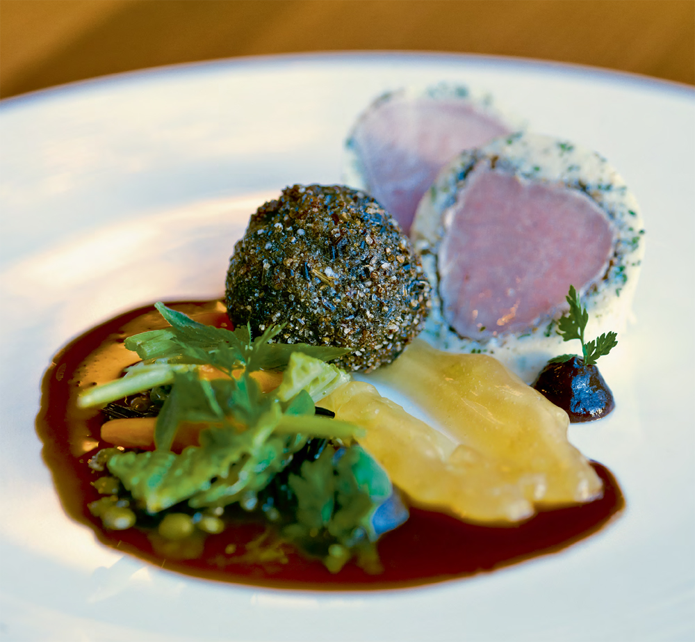 - Slice the pork and position on the serving plate. Place the bon-bon next to the pork.