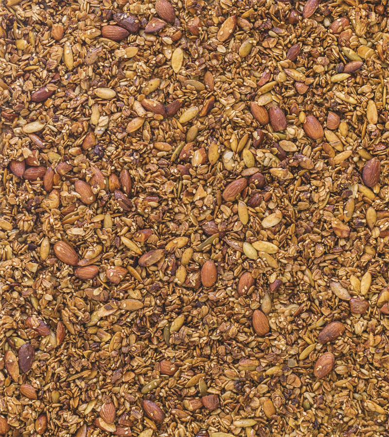 - Divide the granola and spread over the two prepared baking sheets. Bake for 15 minutes undisturbed, then carefully stir once every 15 minutes for 1 hour. Rotate the pans top to bottom and front to back at the 45-minute mark. Bake until the grains are toasted and the granola has a golden-brown color and dry texture. Cool the granola completely before storing in a sealed container at room temperature for up to 1 month.