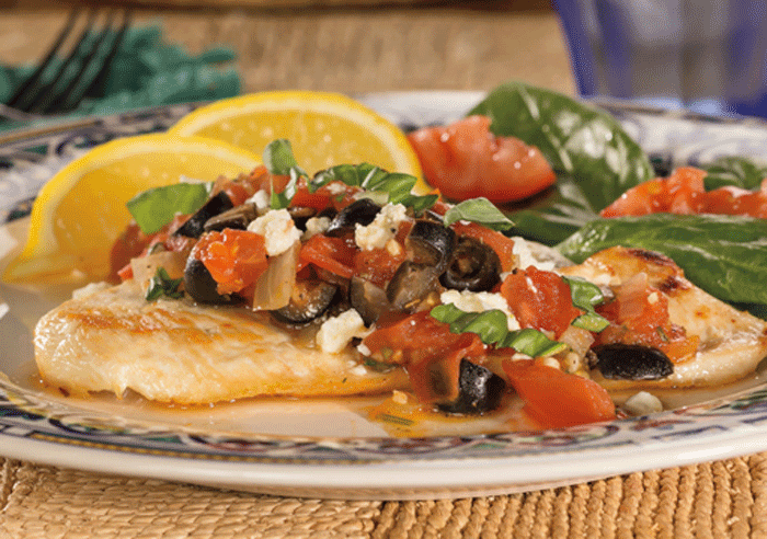 - Return chicken to skillet. Add olives, oregano, parsley, salt, and pepper, and cook 2 to 3 minutes, or until warmed through. Sprinkle with feta cheese and serve.