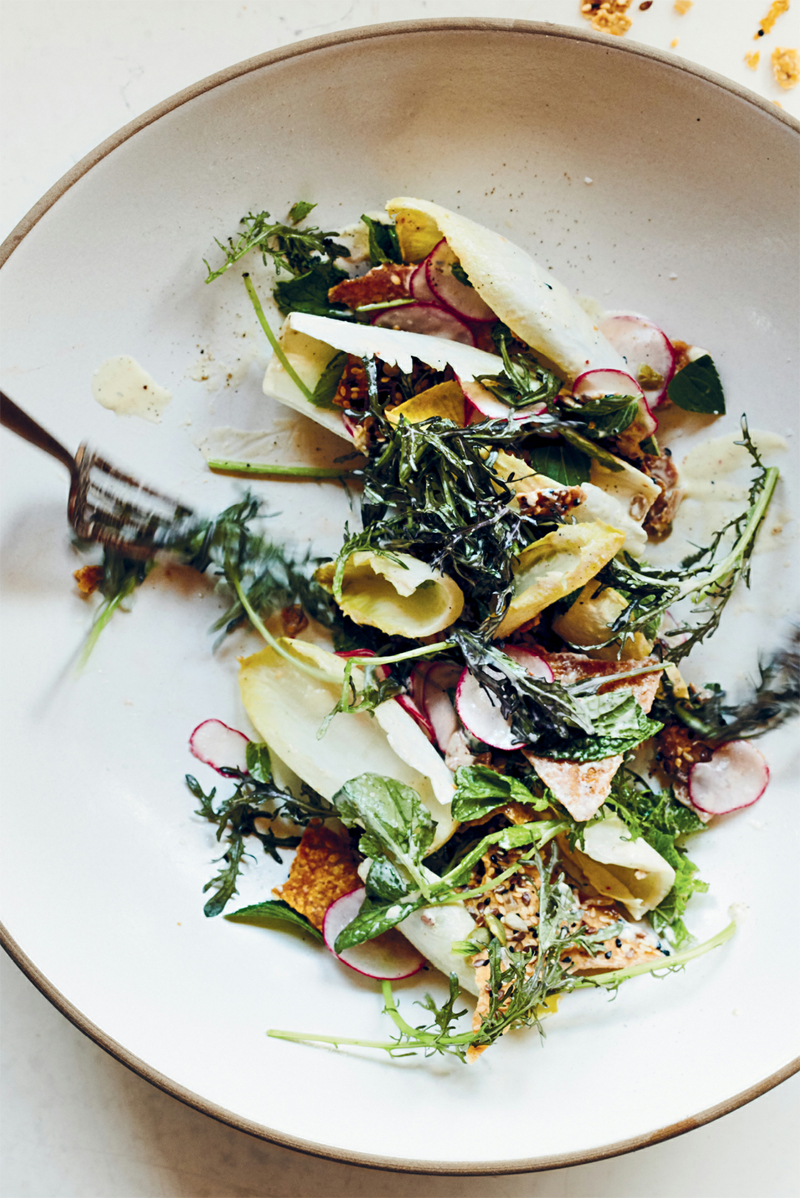 - In a large bowl, combine the greens, radishes, crackers, mint, salt, and pepper. Toss with half of the vinaigrette and give it a taste. Add more vinaigrette if the salad seems dry or serve the rest of the vinaigrette on the side.