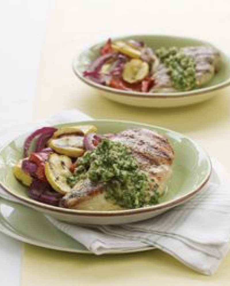 - Place chicken and vegetables on a grill rack coated with cooking spray. Grill chicken 6 minutes on each side or until done; grill vegetables 3 minutes on each side. Serve chicken with Chimichurri Sauce. Chimichurri Sauce