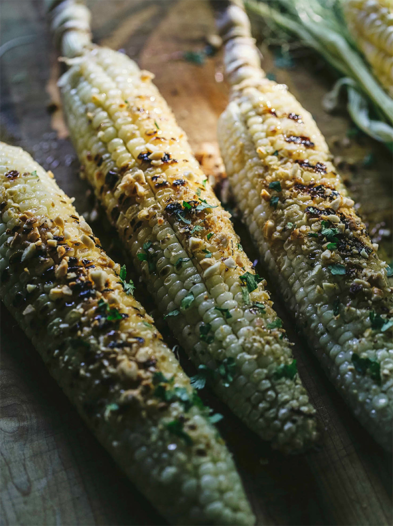 - Transfer the grilled corn to a serving platter and brush liberally on all sides with the salty coconut cream. Sprinkle each ear all over with the coconut flakes and peanut dust, and serve with wedges of fresh lime.