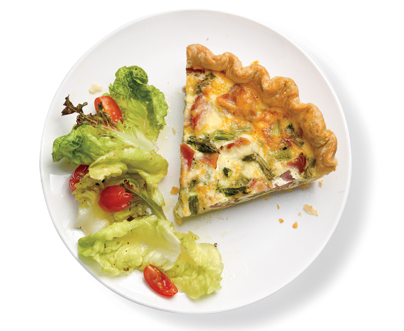 - Beat together the eggs and half-and-half; season with ¾ teaspoon salt and ¼ teaspoon pepper. Mix in the ham, asparagus, and Gruyère. Pour into the piecrust and bake at 325°F until set, 50 to 60 minutes.