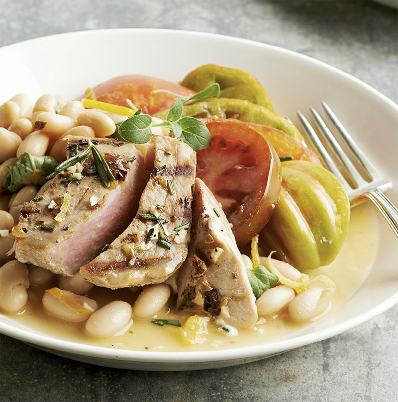 Tomato salads that feature big, meaty slices of succulent, multicolor heirloom tomatoes are a classic way to enjoy what is perhaps the most popular type of all summer produce. The addition of grilled tuna and white beans dressed with an aromatic citrus-anise dressing turns a side salad into a main-dish salad that’s elegant enough to serve to company.