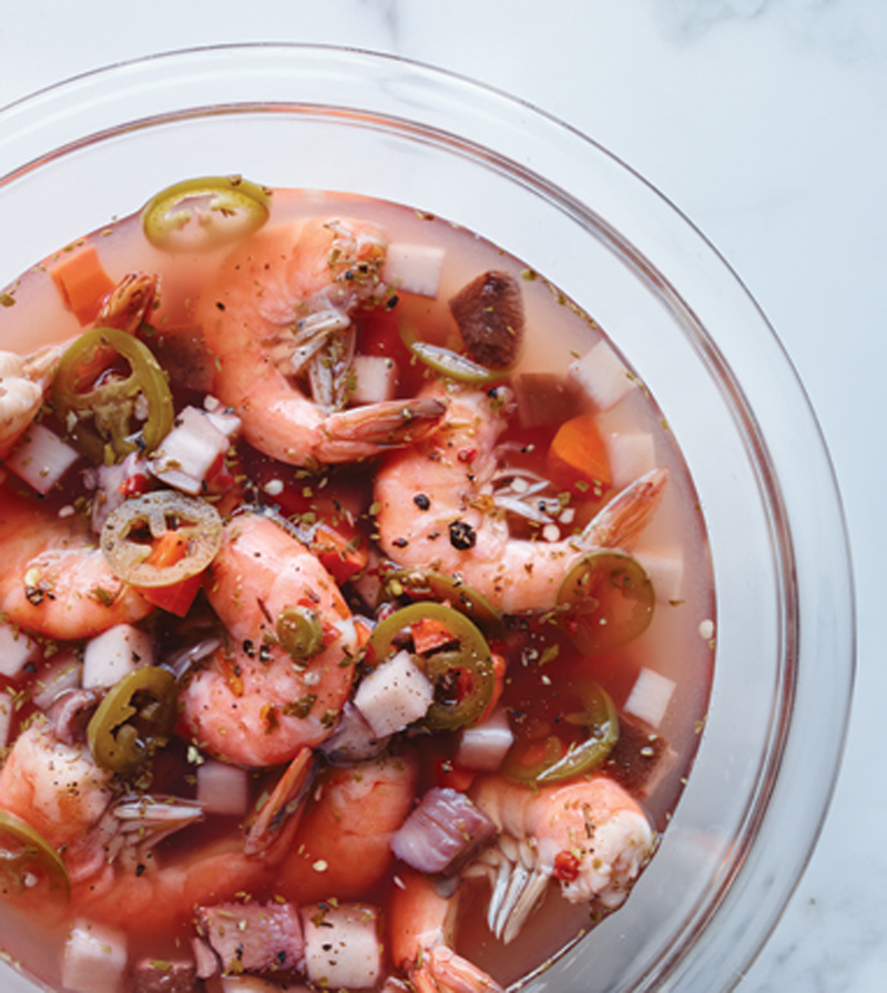 - In a medium saucepan, combine water, vinegar, carrots, mushrooms, turnip, jalapeño, sugar, salt, oregano, fennel, red pepper and black pepper and bring just to a boil, stirring to dissolve the sugar and salt. Transfer the pickling mixture to a large bowl and let cool completely. Meanwhile, Prepare the Shrimp