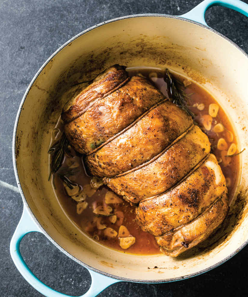 Like chicken, leg of lamb is commonly cooked en cocotte in France, in a covered pot at low heat, yielding its own flavorful jus, with no braising liquid necessary. We were drawn to the promise of succulent, tender meat with minimal hands-on work. Although a bone-in leg of lamb makes for a dramatic presentation, we had no chance of fitting one in our Dutch oven, so we turned to boneless and tied it into an even cylinder. Browning the roast boosted savory flavor and rendered some of the lamb’s fat, which kept our finished dish from becoming greasy or gamy. Some sliced garlic and rosemary classic flavorings with lamb provided aromatic depth. A stint in a low oven produced perfectly tender meat and a flavorful jus. We prefer the subtler flavor and larger size of lamb labeled “domestic” or “American” for this recipe.