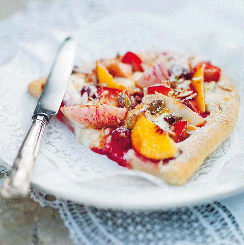 - Slice the strawberries and peaches and distribute these and the raspberries over the pizza.