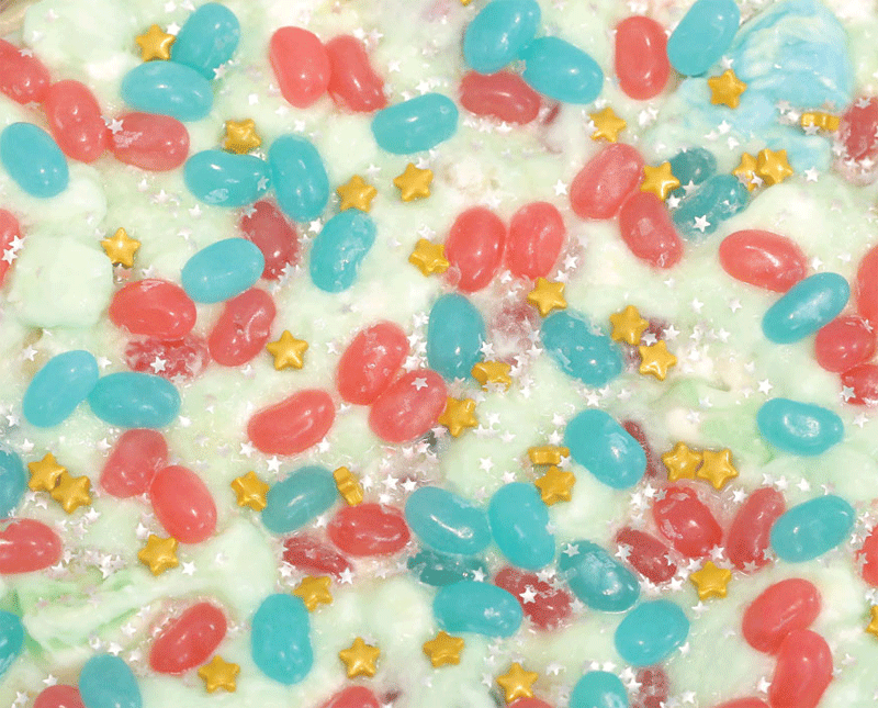 3. Add the macadamia nuts, mermaid-colored candies, and marshmallows and mix until just combined. Divide the mixture between two 9 x 9-inch square aluminum containers, and sprinkle some extra candies on top. Cover with aluminum foil and place in the freezer until set.