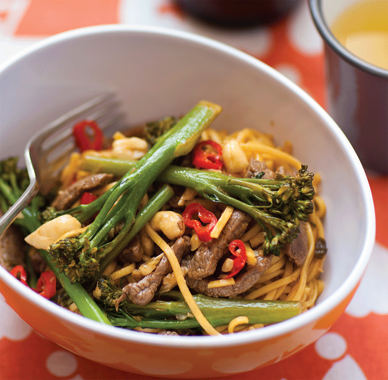 - Prepare the egg noodles according to the instructions on the packet and drain. Put the pan back on the heat and add the remaining oil, the broccoli and spring onions and stir-fry for a couple of minutes. Return the beef mixture to the pan to heat through, then stir in the cashew nuts and the noodles. Divvy up.
