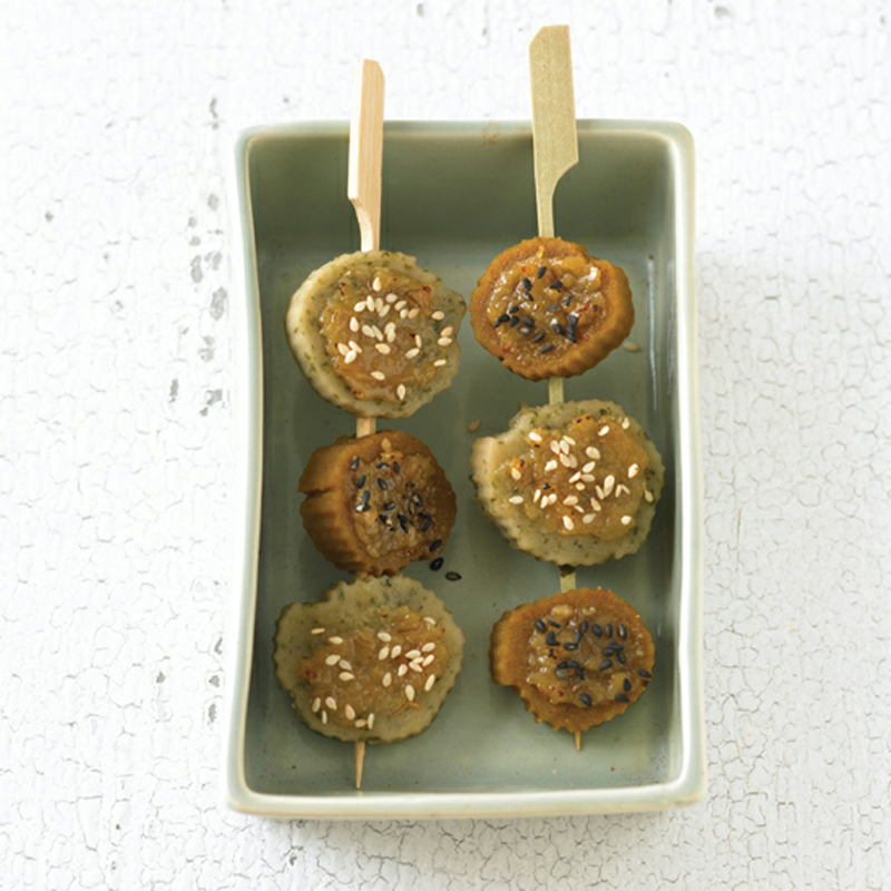 7. To make serving—and eating—simple, thread 2 or 3 disks onto a wooden skewer (the skewers will be easier to insert into disks that are still warm). You can mix colors (and flavors) on a single skewer or keep them separate. Continue until all disks are threaded onto skewers. Garnish with the sesame seeds and serve.
