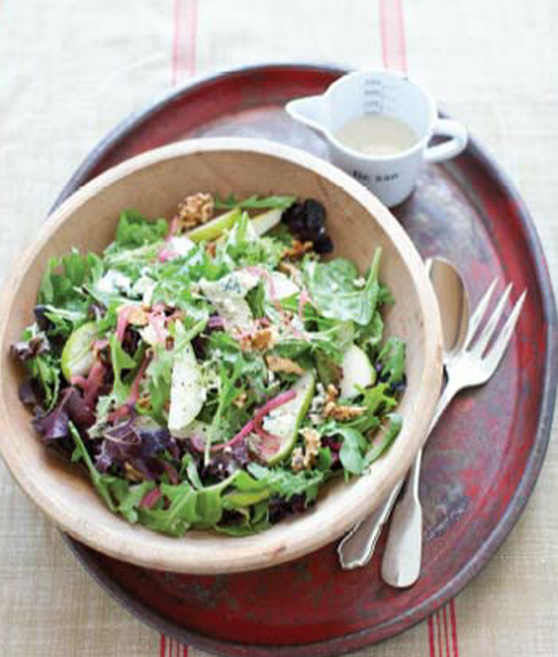 - Lay 5 or 6 slices of pear on top of the greens on each plate. Top with a handful of walnuts, some crumbled blue cheese, and some pickled red onion. Drizzle the remaining vinaigrette over each salad and serve.