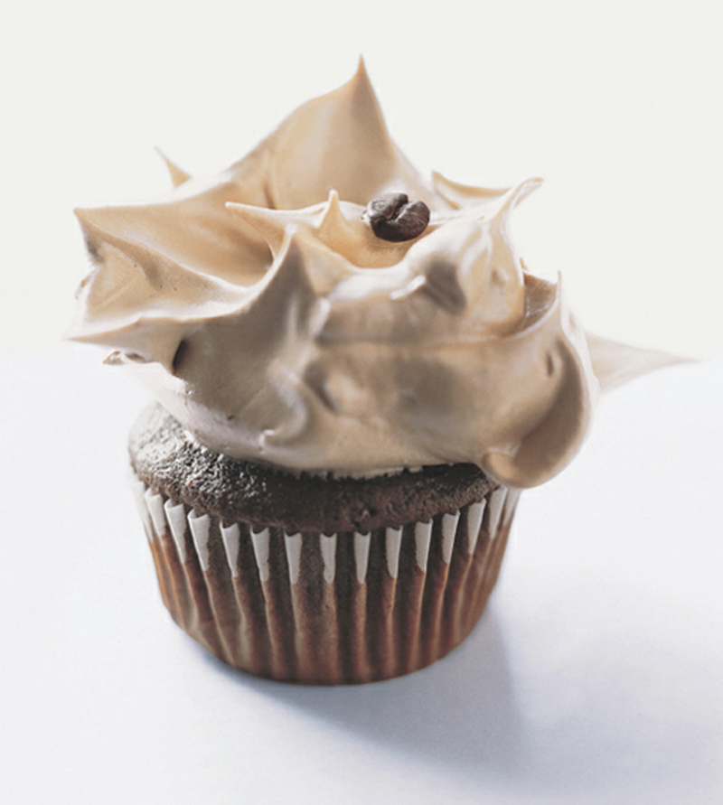 Dramatic peaks of coffee-flavored seven-minute frosting and a single coffee bean crown mocha cupcakes; the coffee variation of Swiss meringue buttercream and chocolate-covered espresso beans would be delicious substitutions.