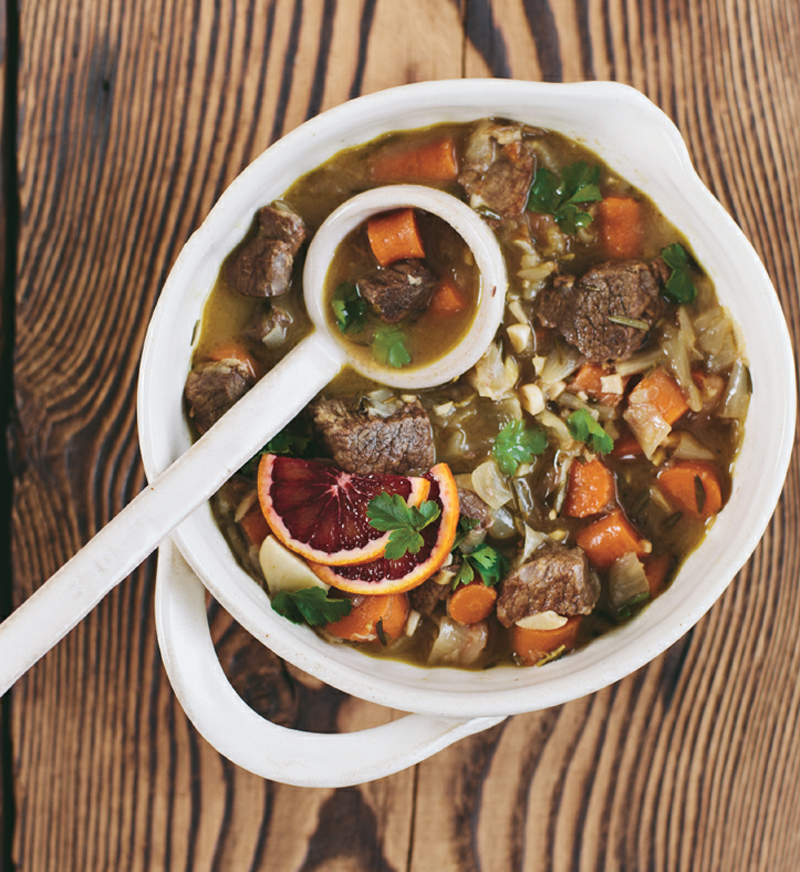 3. Add the vinegar, bone broth, water, carrots, dates and blood-orange juice (you should have about 80 ml) to the pot with the lamb; bring to a boil. Turn down to a bare simmer, cover, and cook for about 1½ hours, until the lamb and veggies are all tender.