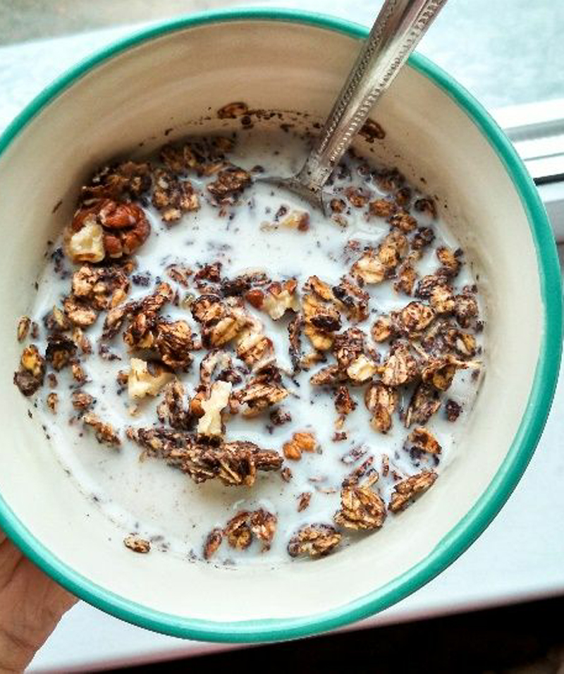 - Pour into a bowl and add the nuts and raisins. Serve with milk.